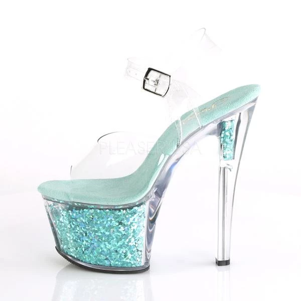 Additional Info: 7″ (178mm) Heel,, 2 3/4″ (70mm) Platform Ankle Strap Sandal w/ Holographic Glitter Filled Platform Bottom.