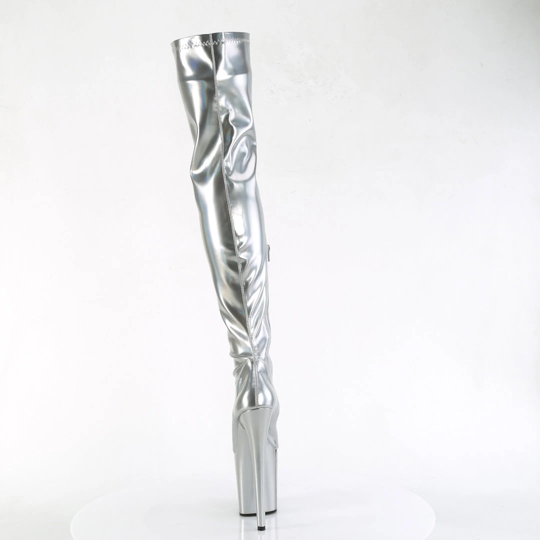 Details: 8 Inch Heel, 4 Inch Plaform Stretch Thigh Boot, Side Zip.